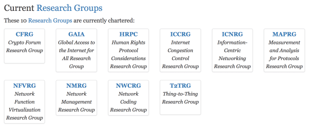 And finally there are research groups which are set up for long-term collaboration on research topics. They have a less focused charter and pursue and share research about a particular topic instead of working towards explicit RFC publication deliverables.
