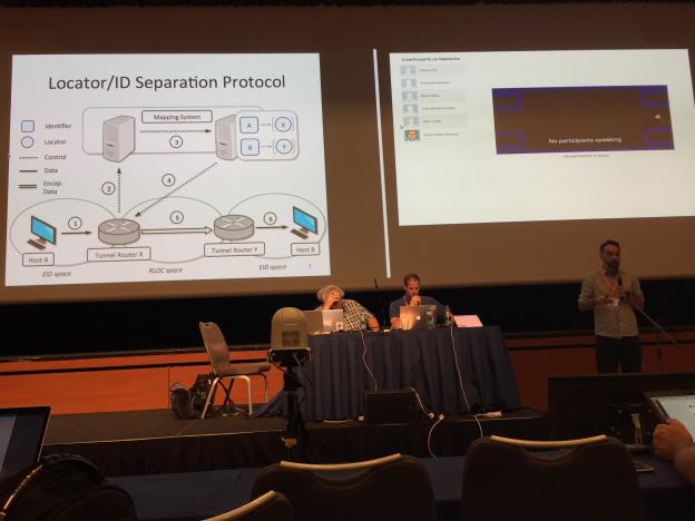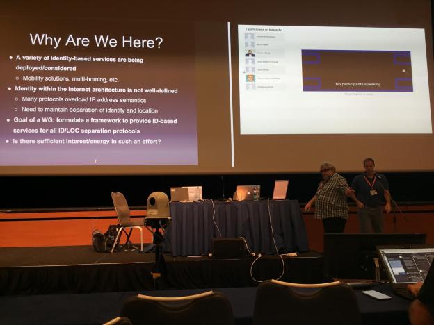 The session discussed the definition of an identity-identifier split, defining an identifier as something similar to but not quite an location identifier, which could be a “valid but often non-routable v4/v6 address” and could “be truncated but managed within a domain of use”. An identity belonged to a machine, not a person. A concept of HIT (host identity tag) for the HIP (host identity protocol?) was a ‘flat’ namespace of identity tags which were v6 address looking things. They wanted to separate identifiers from locations, as “IP addresses have overloaded semantics going back to 1993”.