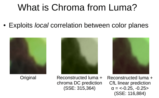 As far as color information in AV1, a technique is being adopted from Daala (a Xiph codec converging with Thor) called CfL – Chrome from Luma. There is a correlation between luma (brightness) and chroma (color) that can be used to predict chroma coefficients directly. It was reported that doing this in the frequency domain sucked, and they are currently proposing to do this in the spatial domain instead.