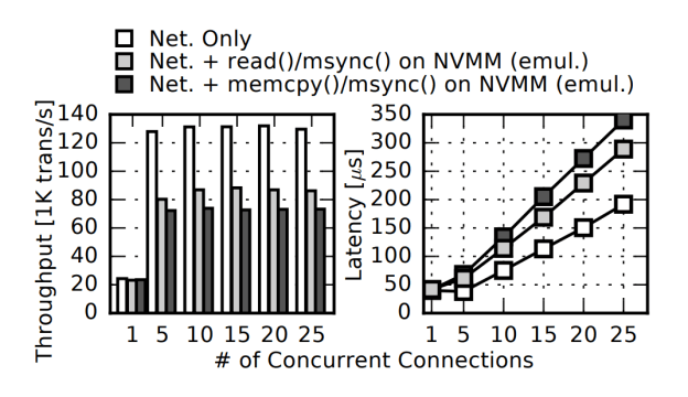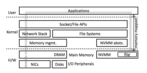 Right now when your computer is downloading a file the data follows a path from the Network Interface Card (NIC) to DRAM (using DMA I believe), then is read from DRAM by the OS networking stack, a read() by the application doing the downloading, then a write() to the storage stack, which is buffered into DRAM and then flushed to disk. This process was measured to have a latency of about 2000µs. By simply replacing the last bit with a copy from DRAM to NVMM, the latency was reduced to about 40µs, showing that the disk flush was extremely significant, as well as the cache misses involved due to the fact that the area of DRAM being read from was an ever-advancing pointer .