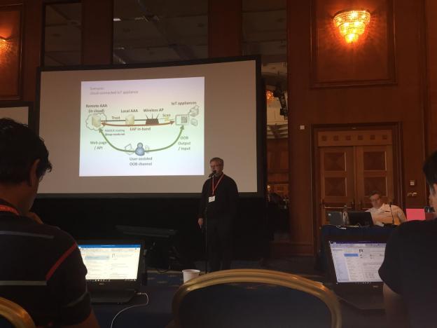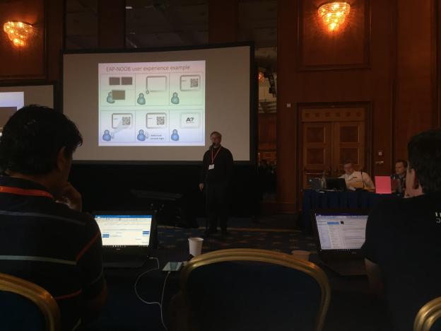 Research and a reference implementation were also presented about one solution for authorizing network access for IoT devices. The proposal, called EAP-NOOB (really), utilizes out-of-band (OOB) communication for network authorization and user account setup. Examples they gave were a smart TV that displays a QR code the user scans with their phone, or a camera taking a picture of a QR code presented on a phone. They suggested other OOB mechanisms such as an audio cable or NFC NDEF message.