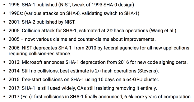 For context, the timeline of a weakness of the hash algorithm SHA-1 was given: