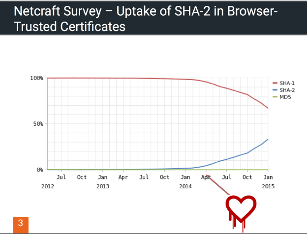 The point being that there were many years between the discovery of a theoretical weakness and an actual successful attack, with a standards organization (NIST) trying to promote an improved version, and resistance by the complacent commercial certificate authorities. That is until they had a change to replace their certificates with SHA-2 after mass revocations due to the OpenSSL “heartbleed” vulnerability.
