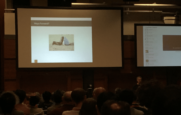 The ideas presented at IDEAS were so dense, complex and impenetrable that I simply can’t imagine any kind of widespread adoption of whatever it is they were pitching. As someone who designs and builds complex systems for software services I have a bad reaction to obviously over-engineered systems and generally prefer simpler and easier to understand, if less powerful solutions. The technical sophistication of a system must be balanced with actual human concerns about ease of adoption, ability to communicate the design in a clear and concise way to other humans, and make the benefits and trade-offs clear so other humans can make informed choices about your system. This was the only session I attended that felt utterly doomed and depressing and I couldn’t sit through the end. In fact it bothered me so much that I did something I was not supposed to: got up and asked a question without reading all of the materials ahead of time. I paid to be here, might as well get my money’s worth.
