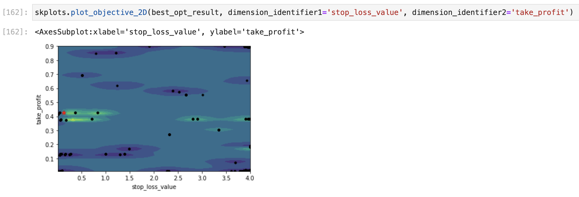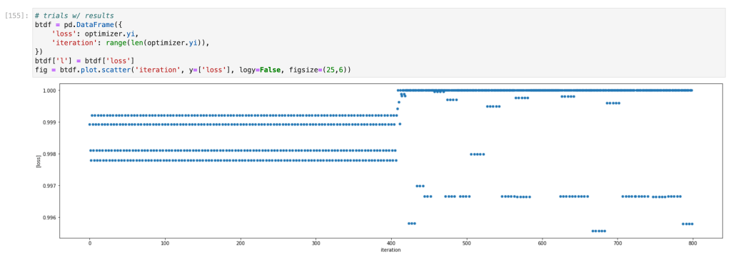 The package contains various strategies for selecting points to test, depending on how expensive your function should be. If the optimizer is doing a good job exploring the input space you should hopefully see loss trending downwards over time. This represents more profitable strategies being found as time goes on.