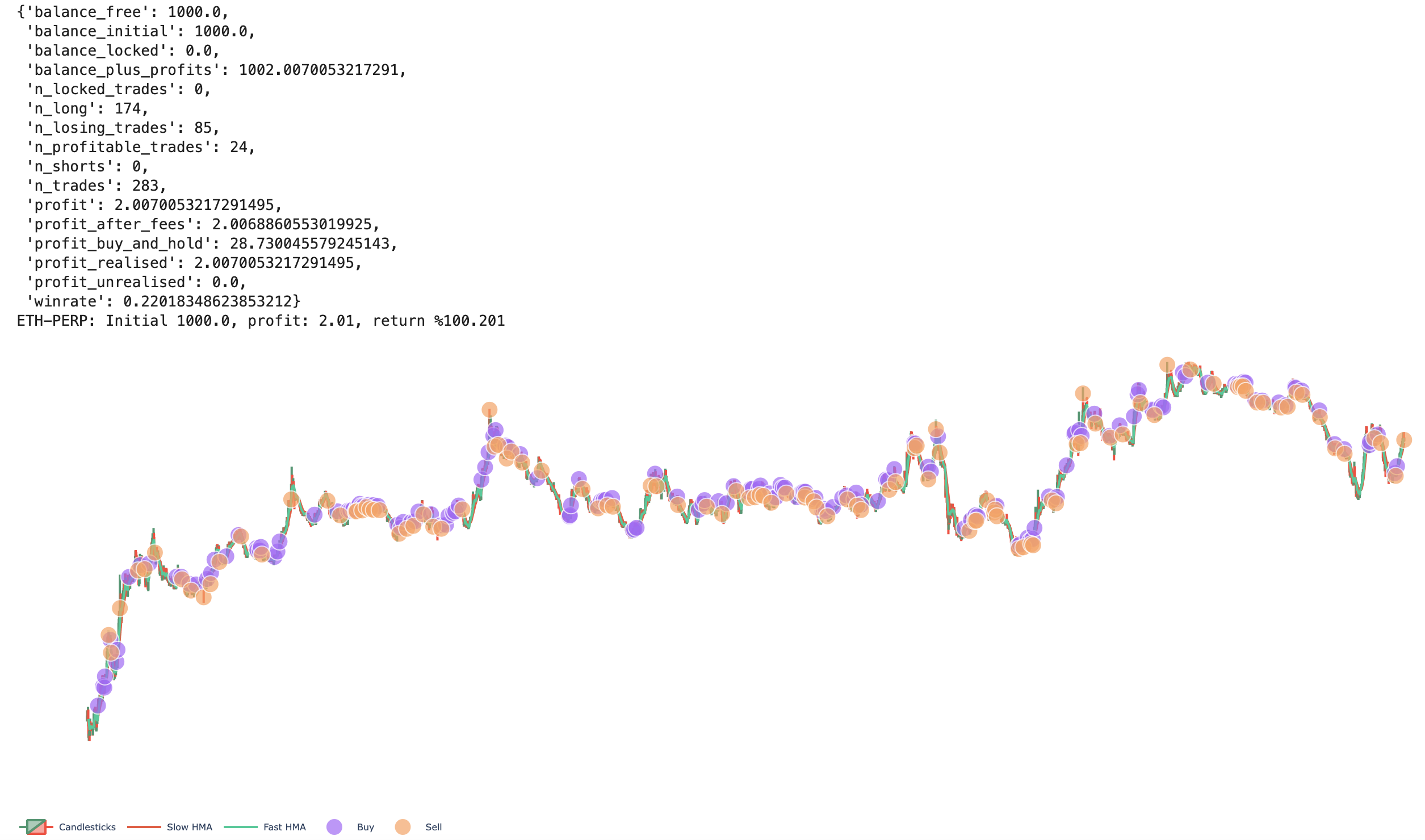 After running the optimizer for a few hundred or thousand iterations it spits out the best inputs. You can then visualize the buying and selling the bot performed during backtesting. This is a good time to sanity-check the strategy and see if it appears to be buying low and selling high.